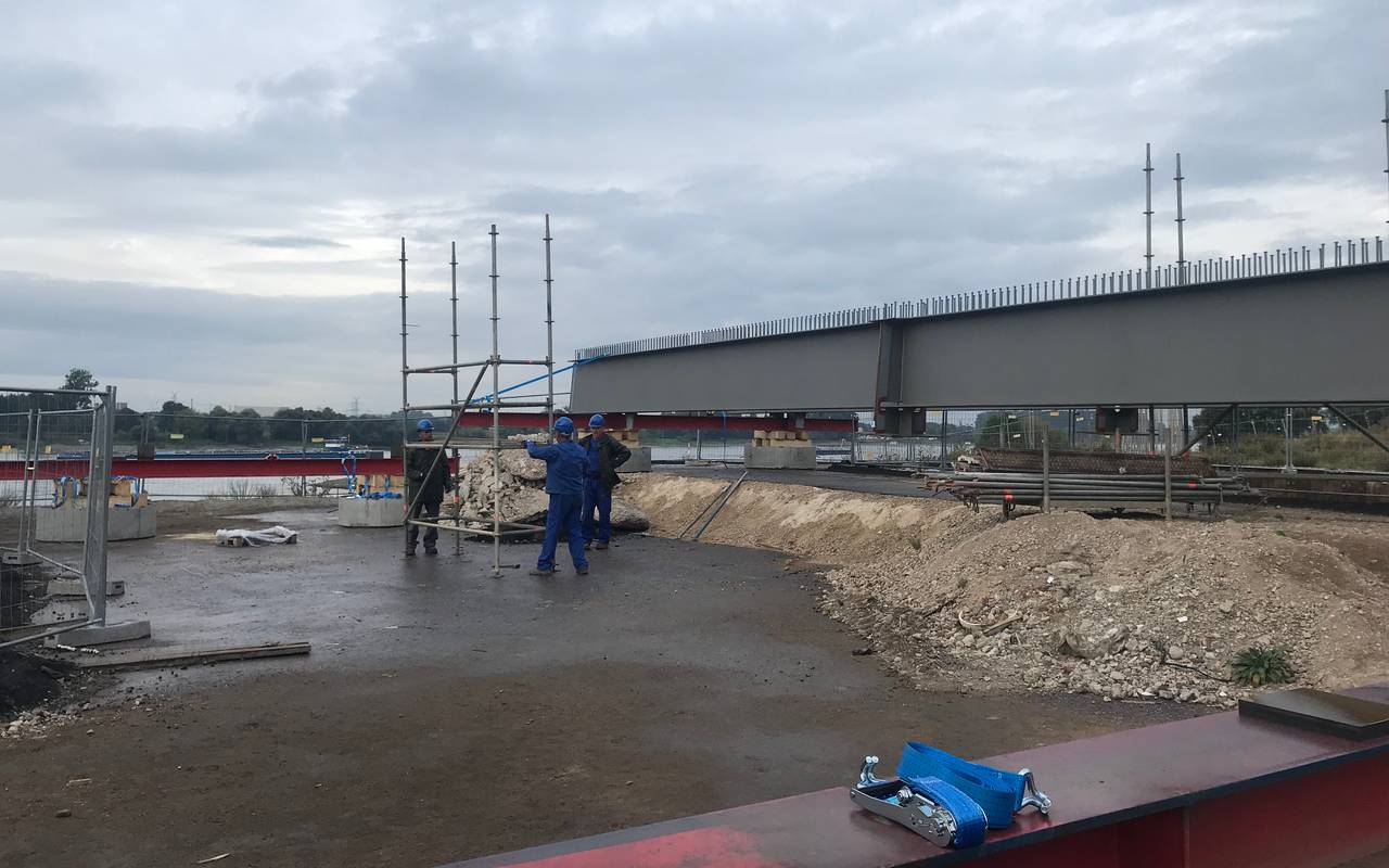 Heute wurden mit Schwertransportern die ersten großen Stahlträger mit einer Länge von 20 Metern geliefert, bis Ende der Woche sollen 1100 Tonnen Stahl für die Brücke ankommen. Sie werden am Rheinufer zu einer fast 70 Meter langen Konstruktion zusammengeschweißt, die im Januar auf die Brückenträger gehievt werden soll.