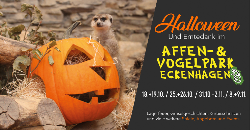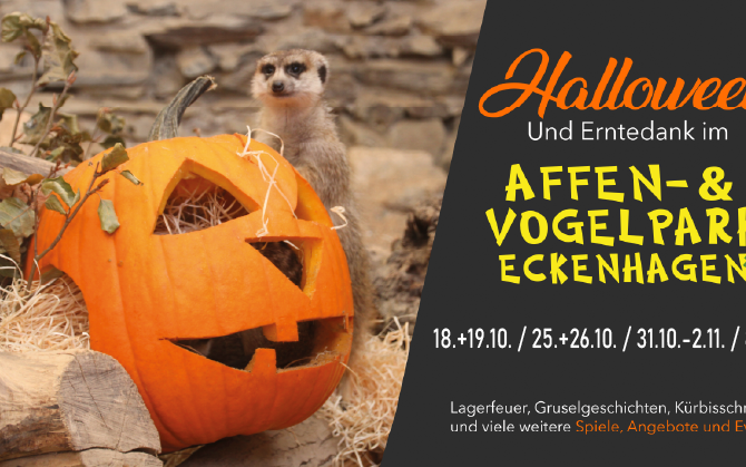 Kinder und Halloween, das passte lange nicht unbedingt zusammen. Zu spät, zu dunkel, zu gruselig… in vielerlei Hinsicht nicht optimal. Der Affen- und Vogelpark will Halloween entgruseln. So können auch Familien mit jüngeren Kindern ganz ohne Gruseln ihre ersten Halloween-Erfahrungen machen. Die Wochenenden sind geschmückt mit einer Hexe, die Gruselgeschichten erzählt, Kürbisbowling, Blechkopfwerfen, einer Fackeldämmerungswanderung, Kürbisschnitzen oder Marshmallows und geröstetem Stockbrot am Lagerfeuer. Dazu gibt es ein Kinderlabyrinth, Schattentheater, Herbstmarkt und zahlreiche kulinarische Angebote.