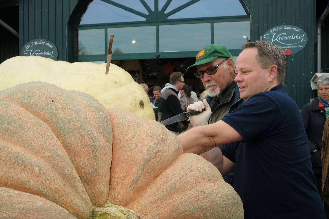 Der Kürbis gehört zum Herbst wie die bunten Blätter - auf dem Krewelshof in Lohmar warten rund 150.000 Stück davon auf große und kleine Besucher. Zum zweiten Mal gibt es dort eine riesige Kürbis-Ausstellung - drinnen wie draußen - und in diesem Jahr steht alles unter dem Motto „Tier-Giganten`. So ist zum Beispiel ein riesen Kürbis-Krokodil zu bestaunen.