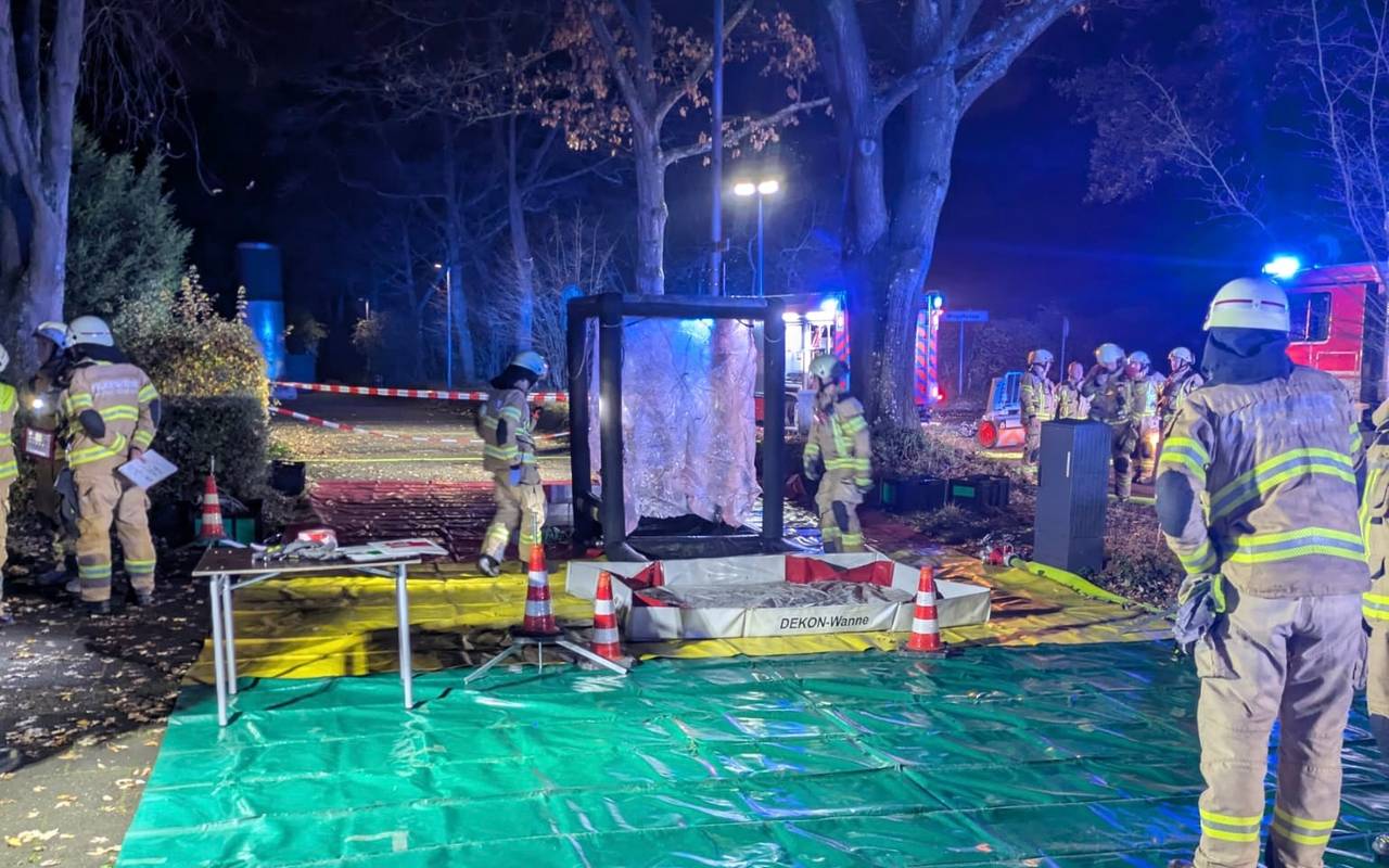 Die Feuerwehrleute gingen unter Schutzkleidung und Atemschutz in den Technikraum vor, sicherten den Stoff und lüfteten den Bereich gründlich. Parallel dazu wurde im Außenbereich vor dem Bad ein Dekontaminationsplatz eingerichtet, um die Einsatzkleidung der Kräfte zu reinigen.