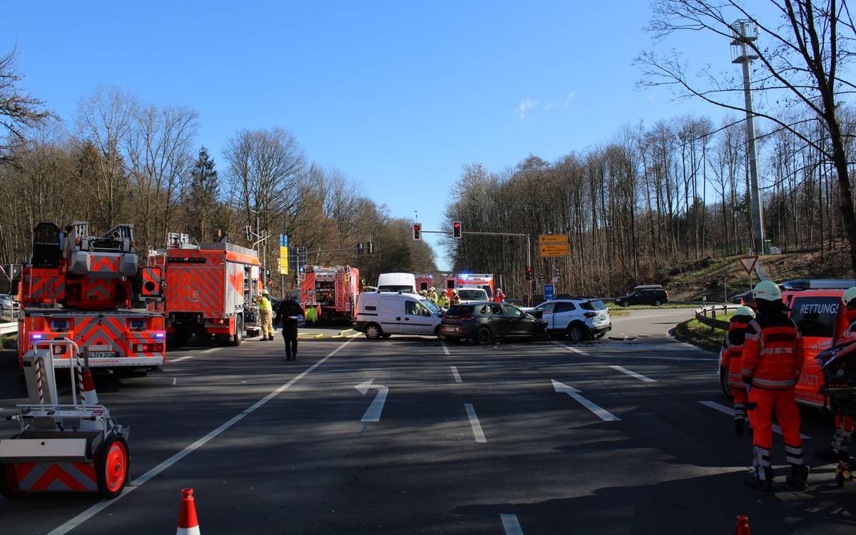 Ein Großeinsatz in Bergisch Gladbach mit vier Verletzten, drei kaputten Autos und viel Stau. Das ist die Bilanz eines Unfalls von Montag Vormittag in der Kreuzung vor der der A 4-Auffahrt Bensberg/Moitzfeld.