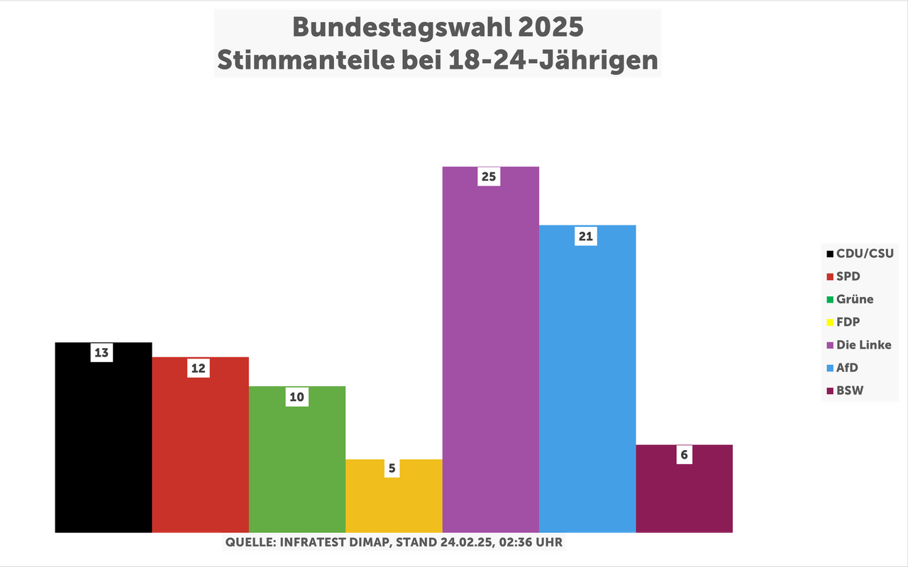 26 Prozent für Die Linke, 21 Prozent für die AfD. Das ist das Wahlergebnis für junge Wählerinnen und Wähler im Alter von 18 bis 24 Jahren bei der Bundestagswahl 2025. Laut Forschungsgruppe Wahlen wurden in diesem Alterssegment also vor allem die Ränder gewählt. CDU/CSU, SPD, Grüne oder FDP lagen zwischen 6 und 13 Prozent. Bei den über 60-Jährigen dominieren vor allem die gesetzten Parteien. CDU/CSU erreichen 38 Prozent, die SPD kommt auf 23 Prozent.