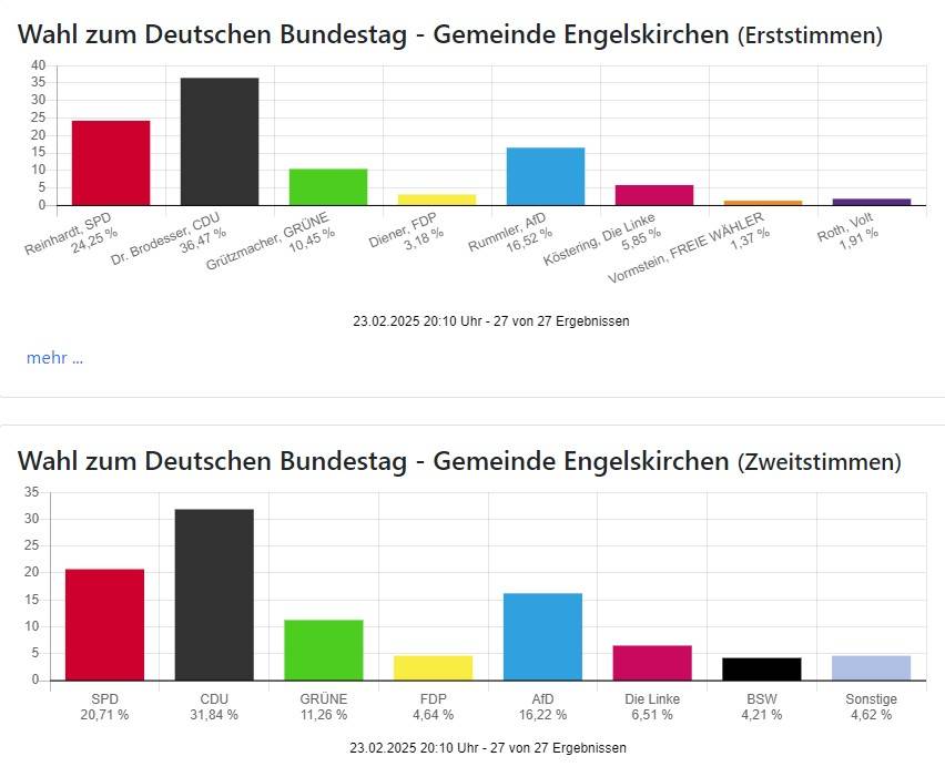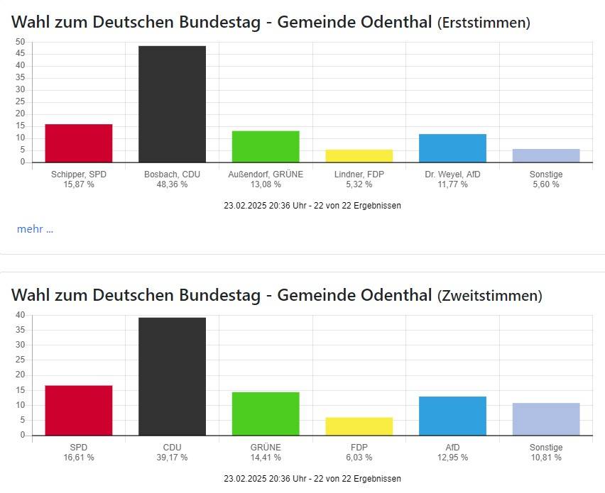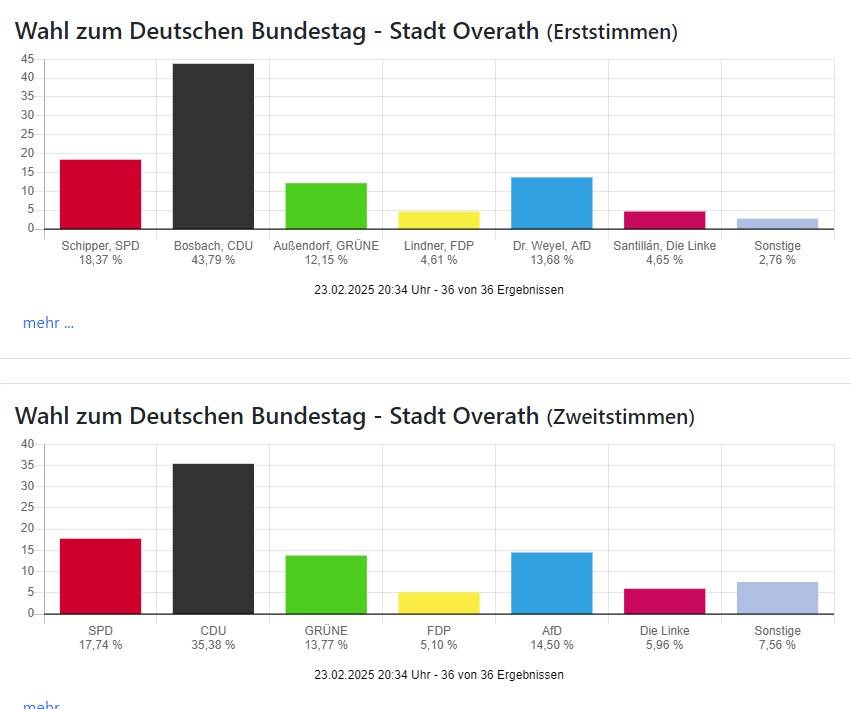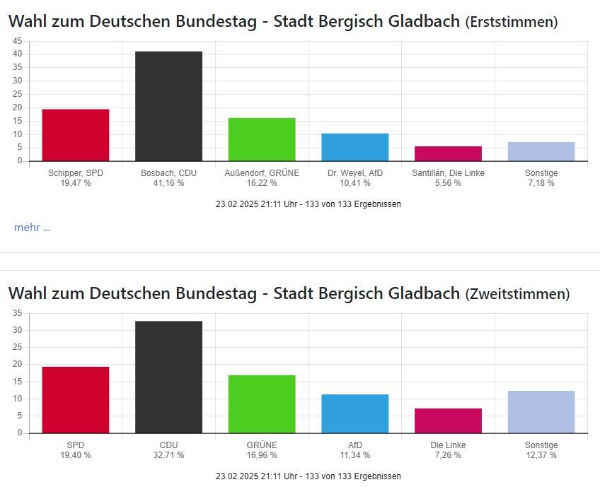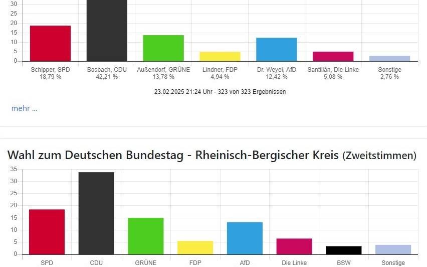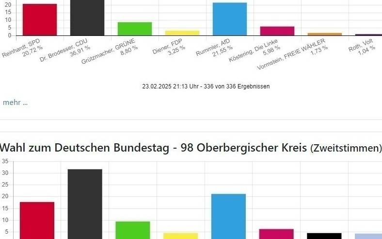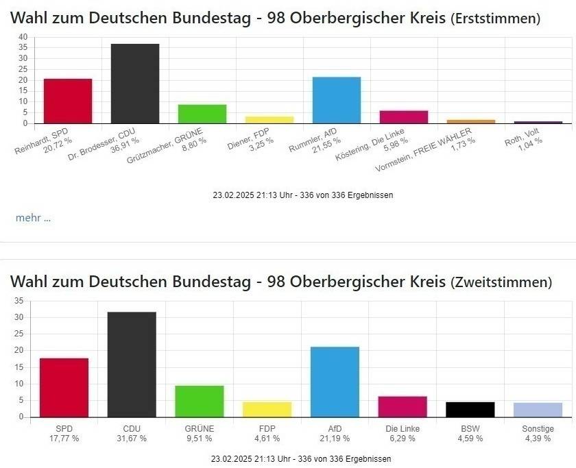 Die Wahlbeteiligung liegt mit 83,11 Prozent in Oberberg und 85,97 Prozent in Rhein-Berg wie auch bundesweit sehr hoch.