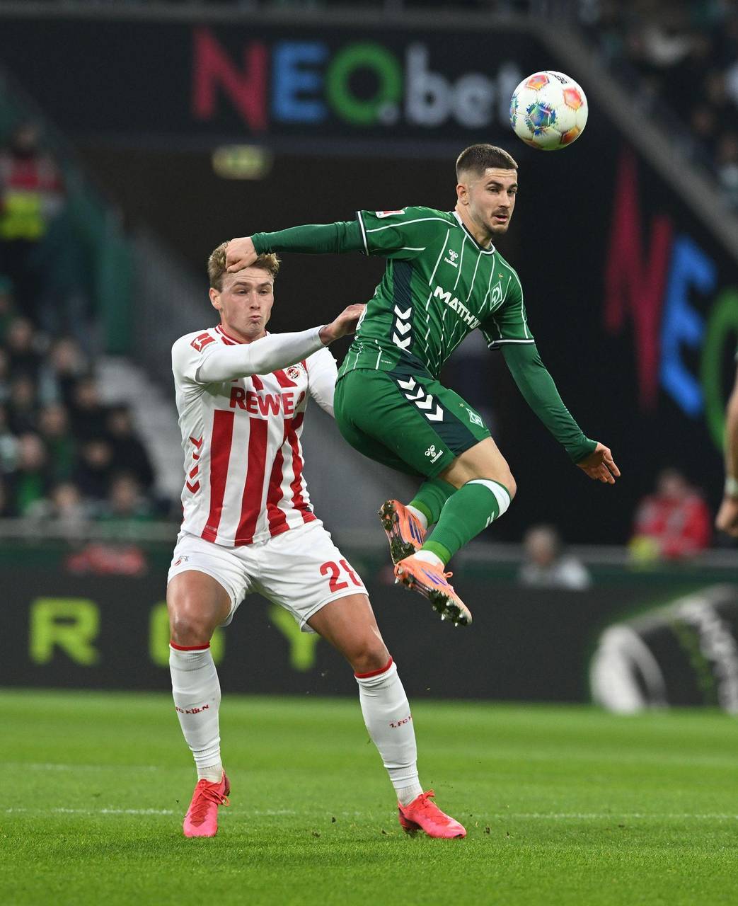 Bremens Romano Schmid (r) geht artistisch zum Ball, der Kölner Sebastian Sebulonsen schaut gebannt zu.