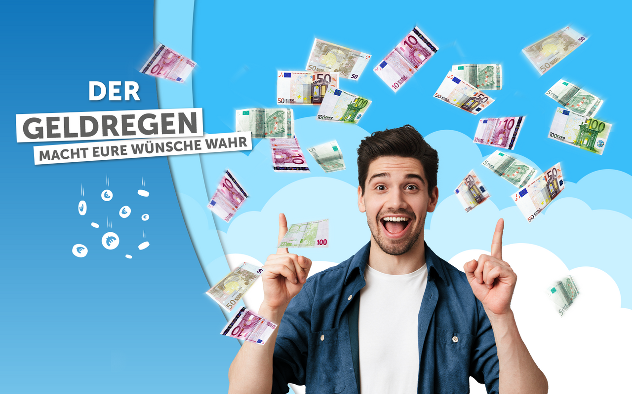 Das beliebteste Radiogewinnspiel geht wieder an den Start: Ihr hört Radio und lasst euch mit etwas Glück euer Konto durch den Geldregen auffüllen. Ab Montag stellen wir euch wieder in den Geldregen und ermöglichen euch euren Traumurlaub, die anstehende Renovierung oder die Spielekonsole, die ihr schon lange haben wollt. Ihr bewerbt euch schon jetzt für die erste Spielrunde am Montag: