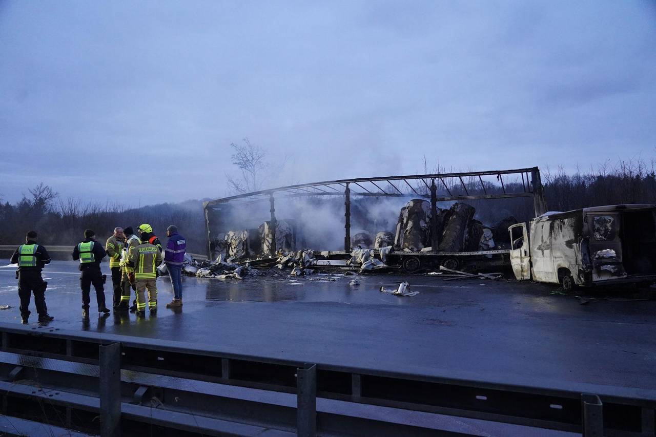 Gegen 1.30 Uhr meldeten mehrere Verkehrsteilnehmer der Polizei Unfälle aufgrund von Straßenglätte. Wie die Polizei weiter berichtete, kam es zu einem Unfall mit einem Lastwagen und einem mit Papier beladenen Sattelaufleger. Der Sattelaufleger brannte. Der Fahrer des Lastwagens konnte den Angaben zufolge nicht mehr aus dem Führerhaus geborgen werden und starb an der Unfallstelle. Der Fahrer des Sattelzugs kam ins Krankenhaus.