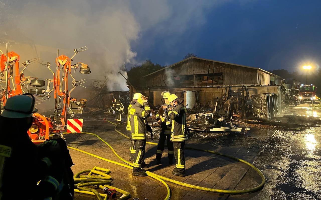 Das Feuer war in der Nacht zu Mittwoch um 2 Uhr ausgebrochen - die Stallungen und eine Scheune standen in Flammen. Die Feuerwehr konnte verhindern, dass die Flammen auf das Wohnhaus übergreifen. Die Scheunen sind laut Feuerwehr komplett ausgebrannt, genauso die gelagerten Maschinen. Große Teile der Gebäude sind eingestürzt oder vorsorglich eingerissen worden. Verletzt wurde niemand.