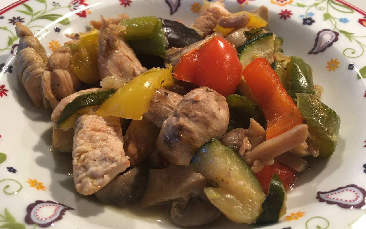 5. Wenn das Fleisch braun angebraten und durch ist, Gemüse mit rein (Champignons etwas später, damit diese knackig sind), weiter anbraten.