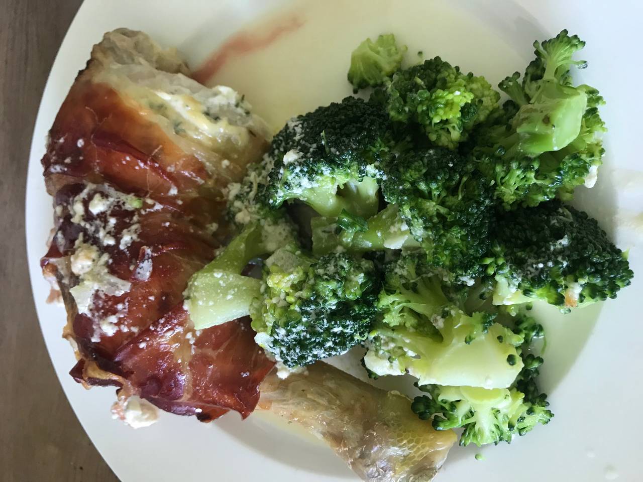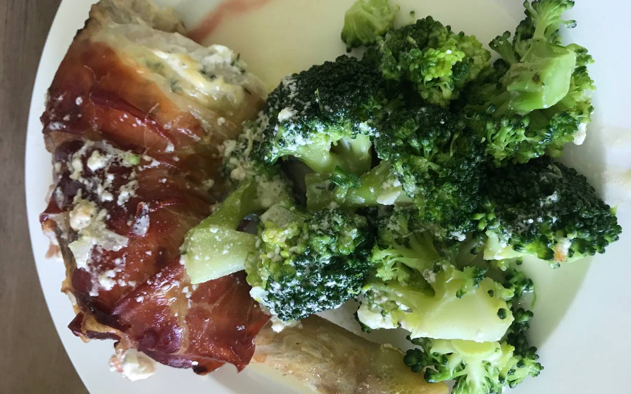 Zubereitung: Knoblauch schälen und fein hacken, mit etwas Abrieb von der Zitrone, Thymian und Mascarpone mischen. - Den Rest der Zitrone auspressen für später. Mischung unter die Haut der Hähnchenschenkel verteilen. Je zwei Scheiben Schinken um einen Schenkel wickeln. Alles in eine kleine mit Olivenöl gefettete Auflaufform geben und für 20 Minuten bei 200 Grad auf der mittleren Schiene backen. Brokoli in kochendem Salzwasser in etwa fünf Minuten bissfest garen. Wenn das Hähnchen fertig ist, rausnehmen und den Zitronensaft mit dem Bratrückständen mischen. Anrichten und Sud über Hähnchenschenkel und Brokoli verteilen.