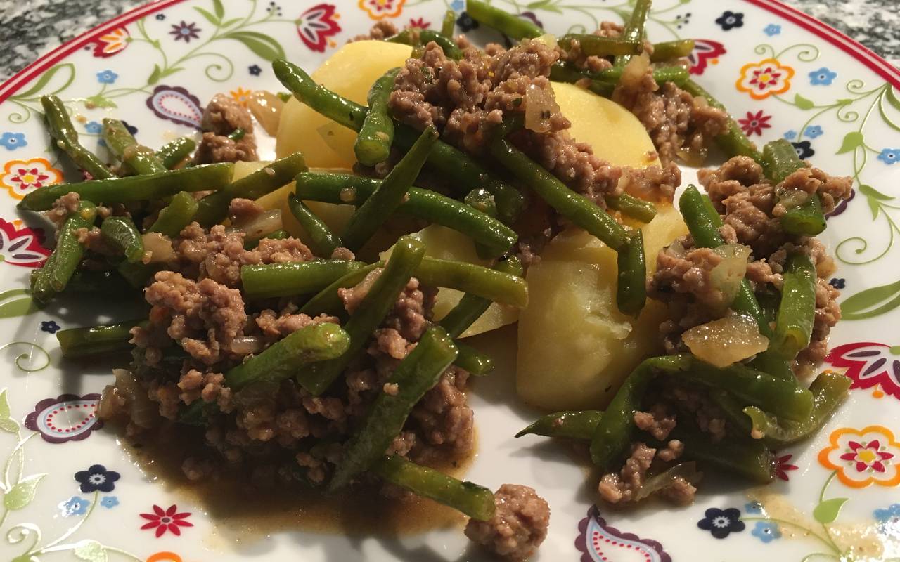 7. Kartoffeln auf einem Teller anrichten, Gehacktes, Bohnen und Co. dazu. Fertig.