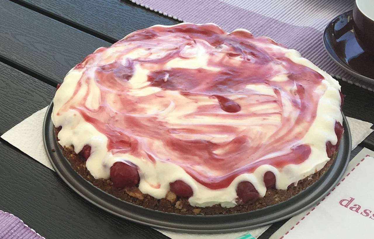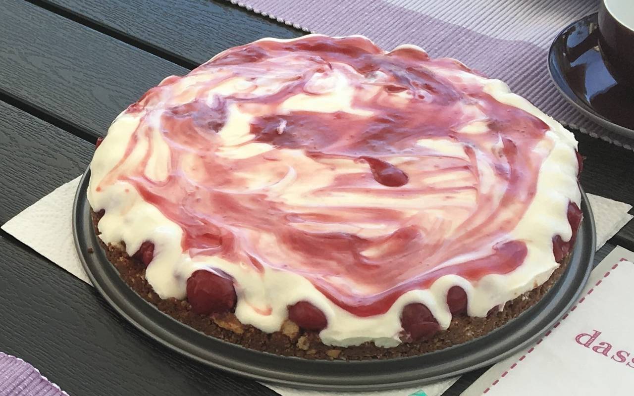 6. Roten Tortenguss, nach Bedarf, hinzufügen, alternativ könnt ihr euch auch etwas rote Masse von der Kirschen-Pudding-Masse übrig lassen und auf die Quarkmasse streichen.