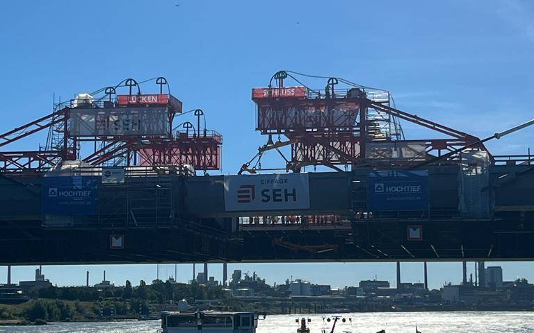 Die Baustelle A1-Rheinbrücke in Leverkusen hat Dienstag Morgen einen neuen Meilenstein erreicht: mit einem letzten Stahlbauteil wurden die beiden bis dato losen Teile der ersten Brückenhälfte miteinander verbunden – die sogenannte Brücken-Hochzeit ist vollzogen.