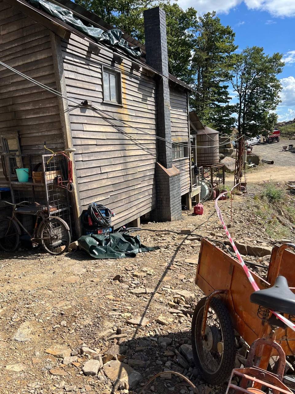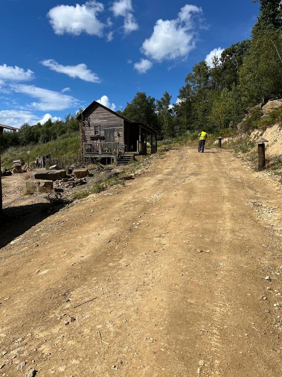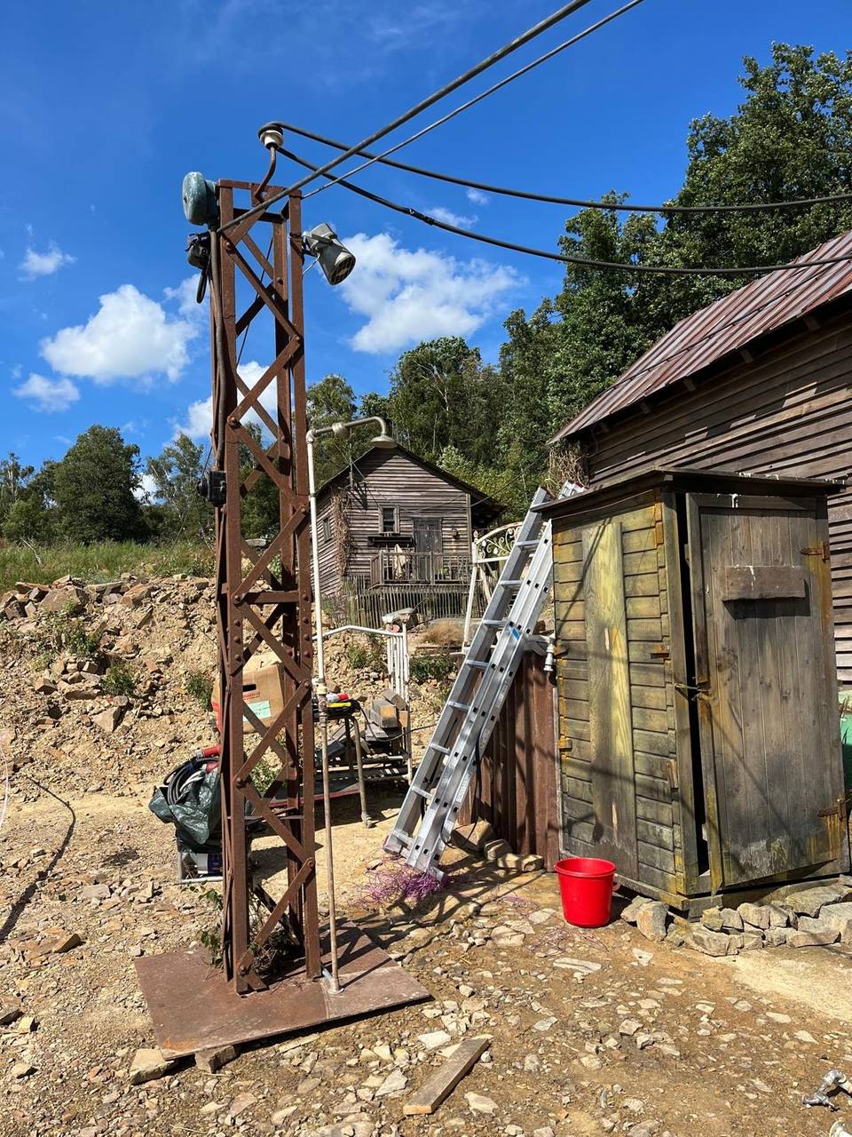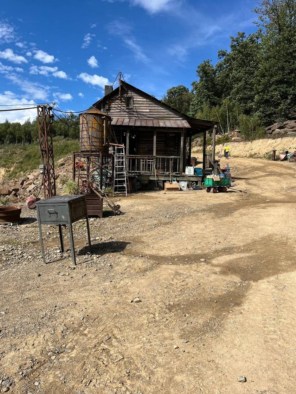Zahlreiche Lkw und Wohnmobile stehen auf dem Gelände, Security-Mitarbeiter sorgen dafür, dass kein Unbefugter in den Bereich der Dreharbeiten kommt. Von der Straße aus sind große Scheinwerfer zu erkennen. Gedreht wird in errichteten Hütten und einem für den Dreh Friedhof am Waldrand.