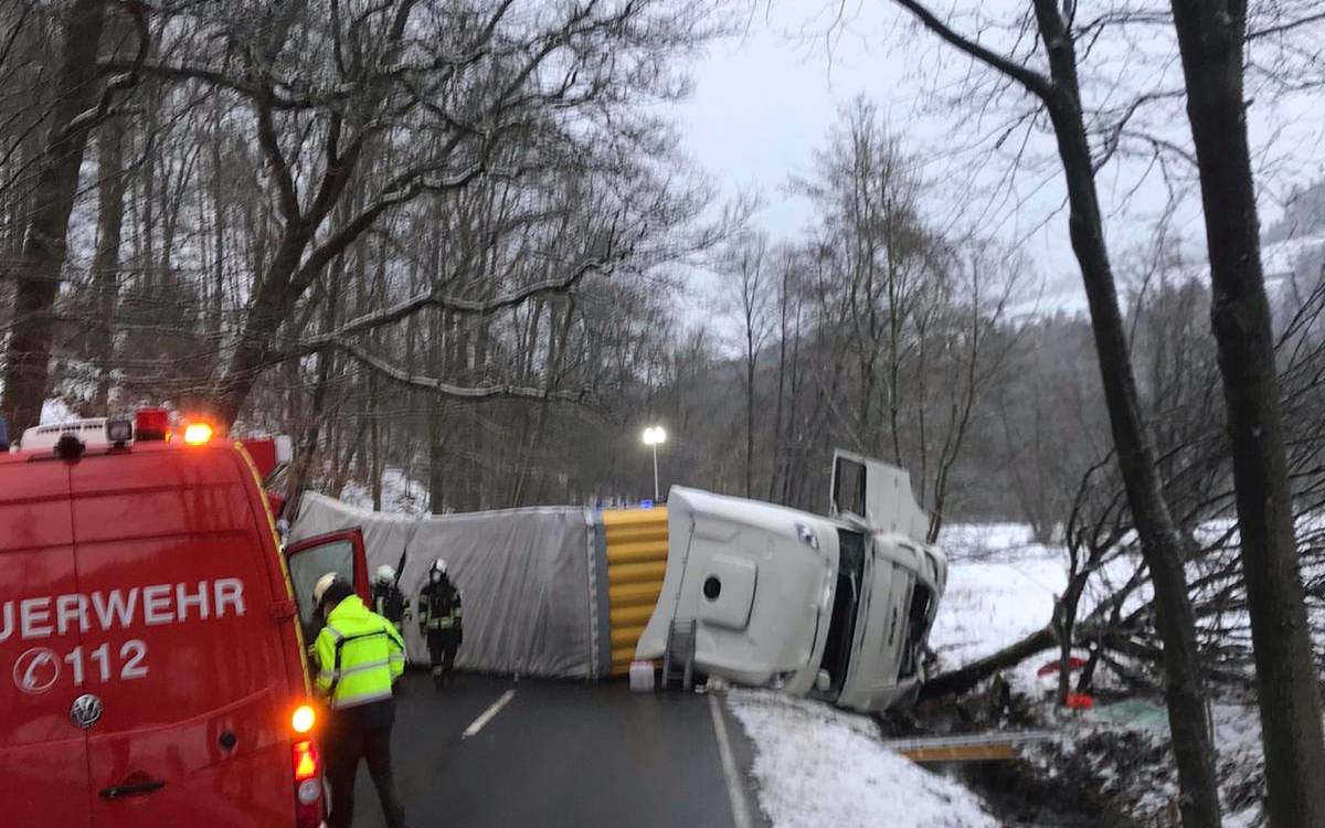 Beim Versuch gegenzulenken geriet der Sattelschlepper außer Kontrolle und kippte um. Er kam quer auf der Fahrbahn liegend zum Stillstand. Der Fahrer und seine Beifahrerin wurden leicht verletzt. Der LKW war mit Saunateilen und Zubehör voll beladen. Die Bergung dauert voraussichtlich bis zum Nachmtittag.
