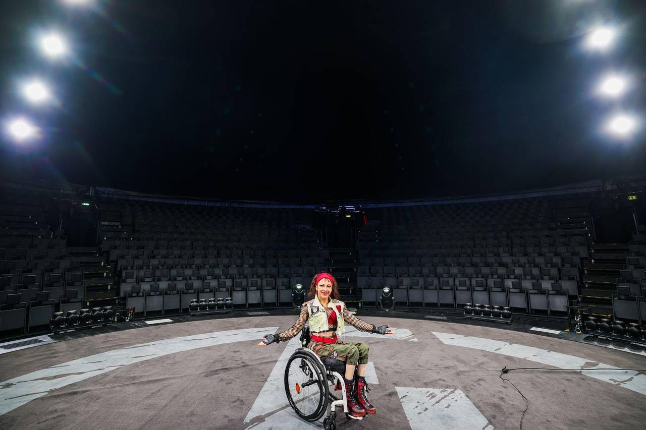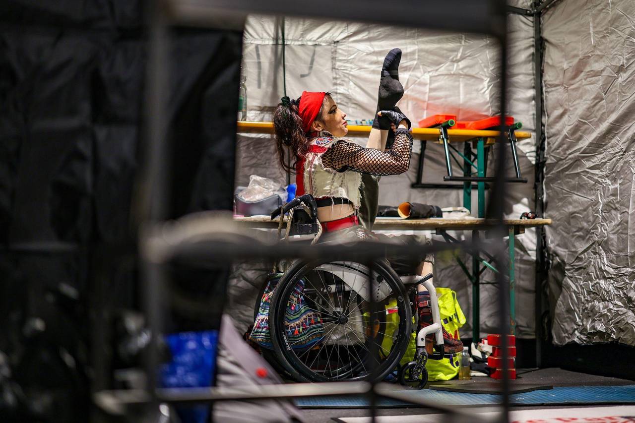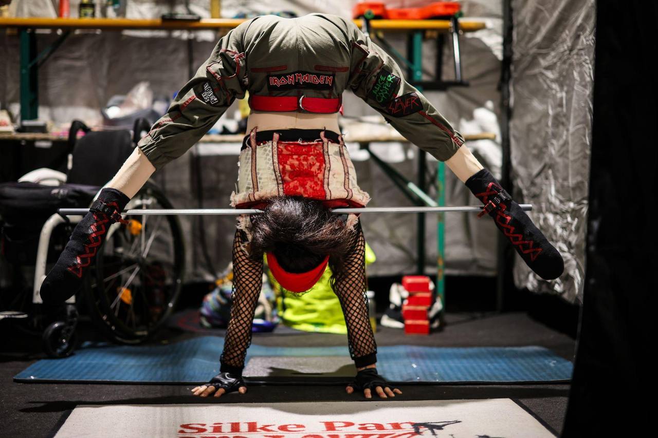 Neben den vielen jungen und unversehrten Körpern, die unter der Kuppel des schwarzen Zirkuszeltes durch die Luft wirbeln, ist Pans Darbietung ein fast schon stiller, aber nicht minder atemraubender Kontrast: Im Rollstuhl fährt die 52-Jährige auf die Bühne, wird von ihrem Mann auf ein Podest gehoben, fixiert ihre Füße an einer Stange - und lässt Sekunden später vergessen, dass sie ihren Unterkörper nicht kontrollieren kann.