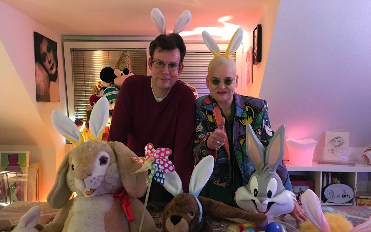 Hella von Sinnen - Halbschwester des Pressesprechers Thorsten Kemper (im Bild mit Hella von Sinnen) - hatte die Idee zur Stadtwette mit den Hasenohren unterstützt und die Ohren gespendet.